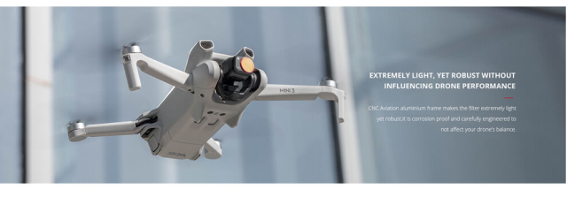 El filtro está fabricado con cristal óptico japonés AGC de doble capa y garantiza una refracción mínima de la luz y una claridad óptica excepcional. Su marco de aluminio CNC, ligero pero robusto, es resistente a la corrosión y está diseñado para mantener el equilibrio del dron durante el vuelo. Gracias a su recubrimiento por ambas caras, es resistente al agua, al aceite y a los arañazos, lo que garantiza su durabilidad y rendimiento a largo plazo. Con una reducción de luz de 1 paso, permite una exposición controlada en condiciones de mucha luz.