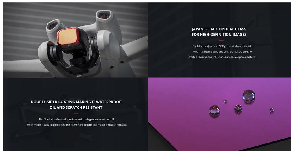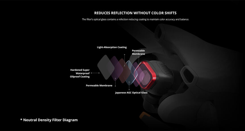 Además de la corrección óptica, el filtro UV actúa como una barrera física que protege la lente y el sensor del polvo, la humedad, el aceite y los arañazos. Su revestimiento resistente al agua, al aceite y a los arañazos garantiza su durabilidad en condiciones exteriores exigentes. Su marco de aluminio mecanizado con precisión mediante CNC es ligero, resistente a la corrosión y está cuidadosamente diseñado para no afectar al equilibrio del cardán ni a las características de vuelo.