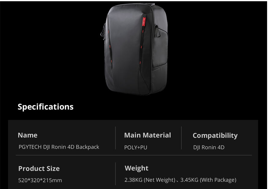 La mochila PGYTECH P-CB-245 es una solución especial para el almacenamiento y el transporte del dispositivo DJI Ronin 4D. Cuenta con separadores configurables, un clip Beetle Clip integrado y un soporte ergonómico que reduce la fatiga del usuario.