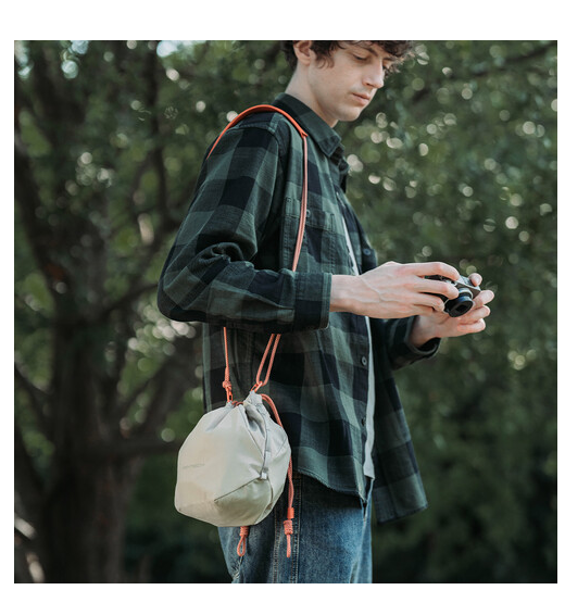 Puedes llevar la bolsa en la mano o al hombro con la correa acolchada, o incluso usarla como funda para la cámara dentro de una bolsa más grande. El cierre de cordón seguro con broches de seguridad protege tu equipo, mientras que el bolsillo oculto para el Apple AirTag te permite rastrear la bolsa si la pierdes. La bolsa está fabricada en nailon y poliuretano resistentes al agua con interior de poliéster, es ligera y resistente y pesa solo 0,18 kg.
