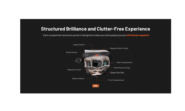 En el interior hay separadores acolchados ajustables, un bolsillo interior para baterías y bolsillos magnéticos que permiten organizar de forma clara los accesorios, como baterías, filtros, cables, baterías externas y discos duros. Su diseño de amplia apertura permite un acceso rápido a tu equipo, mientras que el compartimento frontal de acceso rápido es ideal para objetos esenciales como el teléfono, las tarjetas y las llaves.