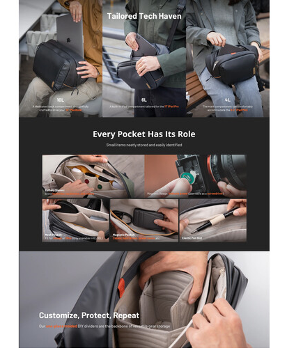 La PGYTECH OneGo Solo Sling Bag V2 (P-CB-155) es una bolsa para cámara de diseño inteligente pensada para el uso diario, destinada a fotógrafos, cineastas y creadores que viajan con frecuencia. Con una capacidad de 10 litros, tiene espacio suficiente para una cámara y hasta tres objetivos en el compartimento principal, mientras que el bolsillo trasero especial permite guardar de forma segura un MacBook de 14" o un iPad Pro de 12,9".