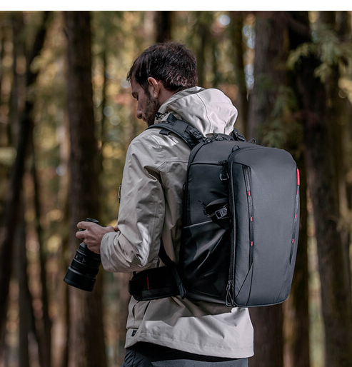 La comodidad es una prioridad gracias al panel trasero de alto rendimiento, las amplias correas acolchadas para los hombros y el resistente cinturón lumbar, que garantizan un transporte estable durante largas sesiones de rodaje o viajes. El exterior recubierto de PU resistente a las salpicaduras y la funda impermeable incluida ayudan a proteger el equipo de las inclemencias del tiempo. Otras características profesionales incluyen cremalleras YKK, un bolsillo patentado con indicador de batería, varios asideros, presillas para trípode, un bolsillo oculto para AirTag y un bolsillo en la correa de hombro para tu smartphone.