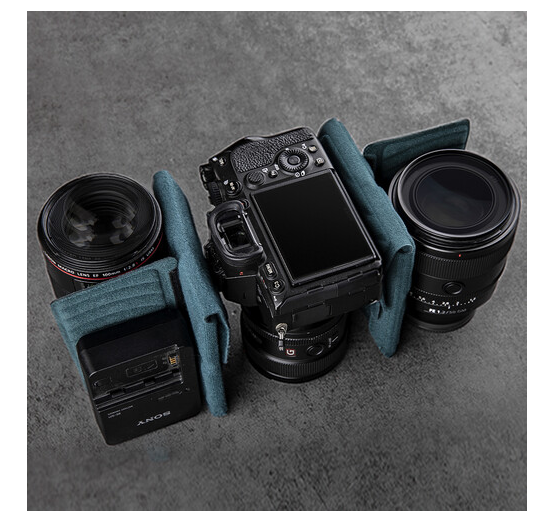Para una mayor adaptabilidad, la sección central se puede desabrochar y ampliar, lo que aumenta la capacidad de 11 l a 13,5 l. En este espacio ampliado cabe una cámara réflex digital con un objetivo de 70-200 mm montado verticalmente, dos objetivos adicionales y un MacBook Pro de hasta 14 pulgadas. En el interior, el equipo queda protegido por separadores acolchados ajustables, mientras que el bolsillo para baterías con indicador de carga te ayuda a gestionar eficazmente las baterías cargadas y descargadas.