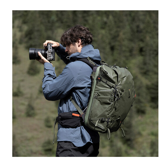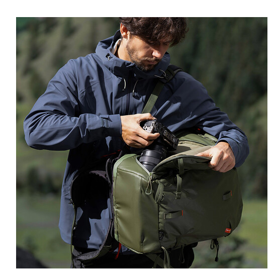 La mochila está fabricada con material HyperGuard —un tejido Cordura resistente con acabado de PU— y es resistente a las salpicaduras, a la abrasión y a los desgarros, por lo que tu equipo permanecerá a salvo en cualquier condición. La apertura completa de 180° permite un fácil acceso a todos los compartimentos, tanto desde arriba como desde el lateral. El bolsillo oculto para AirTag te ayudará a localizar tu mochila, mientras que la correa lumbar con presillas para la cámara y el bolsillo elástico para la botella de agua aumentan la comodidad durante tus aventuras al aire libre. La mochila también incluye hebillas de compresión magnéticas, un silbato de seguridad integrado y una funda impermeable para mayor protección.