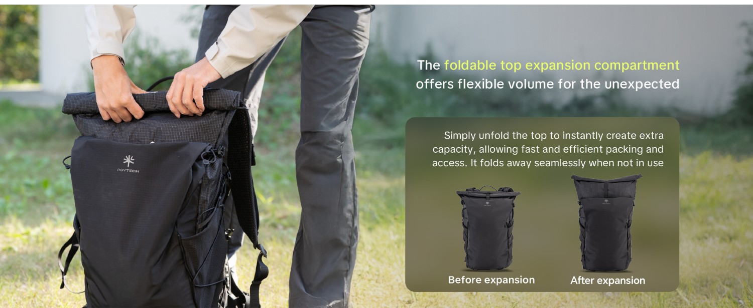 El compartimento superior extensible y plegable ofrece un volumen flexible para situaciones inesperadas.