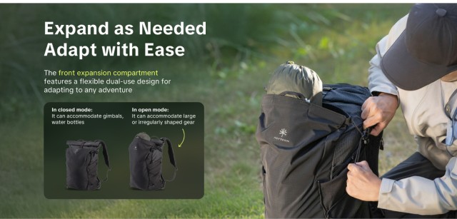 El compartimento delantero extensible tiene un diseño flexible de doble uso que se adapta a cualquier aventura.