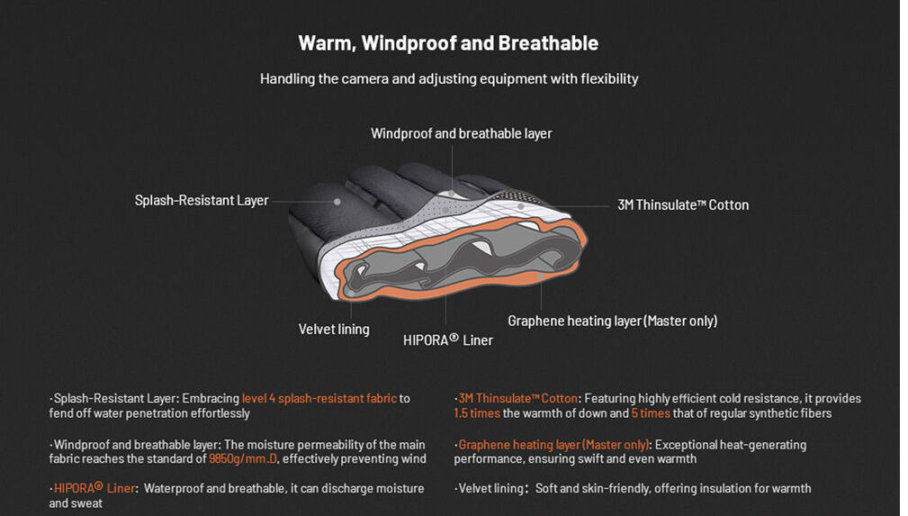 Los guantes combinan algodón 3M Thinsulate, un forro HIPORA impermeable y transpirable, una capa cortavientos y un tejido resistente a las salpicaduras para proteger tus manos del frío, el viento y la humedad. Las palmas acolchadas de cuero y el relleno de SBR mejoran el agarre y la comodidad, mientras que el forro de terciopelo aporta suavidad y aislamiento. Los dedos remangados permiten un fácil acceso para un manejo preciso de la cámara, y la correa para la muñeca con hebilla evita que se pierdan los guantes y los mantiene juntos. Estos guantes son ideales para temperaturas extremas de -31 a 32 °F (-35 a 0 °C) y son el compañero perfecto para la fotografía al aire libre en invierno.