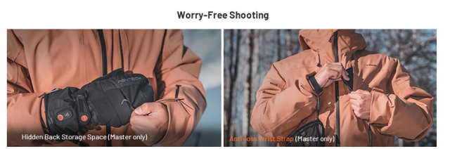 Para una fotografía precisa, los guantes están equipados con solapas retráctiles en los dedos que permiten descubrir rápidamente los dedos al ajustar los controles de la cámara. Las palmas de piel auténtica con acolchado SBR proporcionan un agarre seguro y antideslizante, así como una excelente amortiguación de impactos. El suave forro interior de terciopelo garantiza comodidad y un aislamiento respetuoso con la piel.