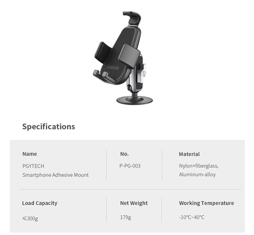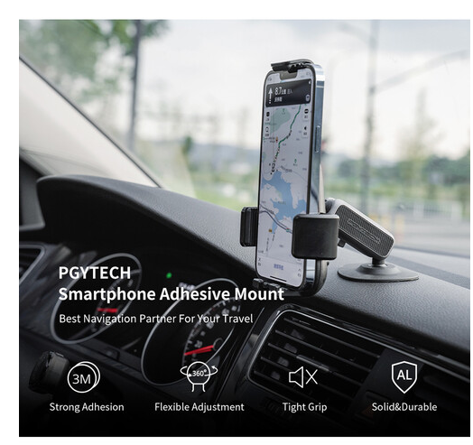 Con el soporte adhesivo PGYTECH Full Wrap Smartphone Adhesive Mount, podrás fijar tu smartphone de forma segura a casi cualquier superficie plana. Gracias al adhesivo ultrarresistente 3M VHB, a la rótula doble y a la rotación de 360°, ofrece una sujeción estable, ajustable e inalámbrica del teléfono para conducir, grabar vídeos o el uso diario.