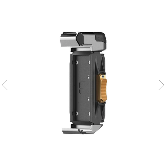 El soporte para trípode móvil más seguro ahora cuenta con un soporte superior para una rótula de bola y un soporte inferior con rosca de ¼"-20 para micrófonos, luces u otros accesorios. Pero eso no es todo: este soporte también funciona como empuñadura ergonómica, lo que te permite grabar cómodamente tanto en posición vertical como horizontal.