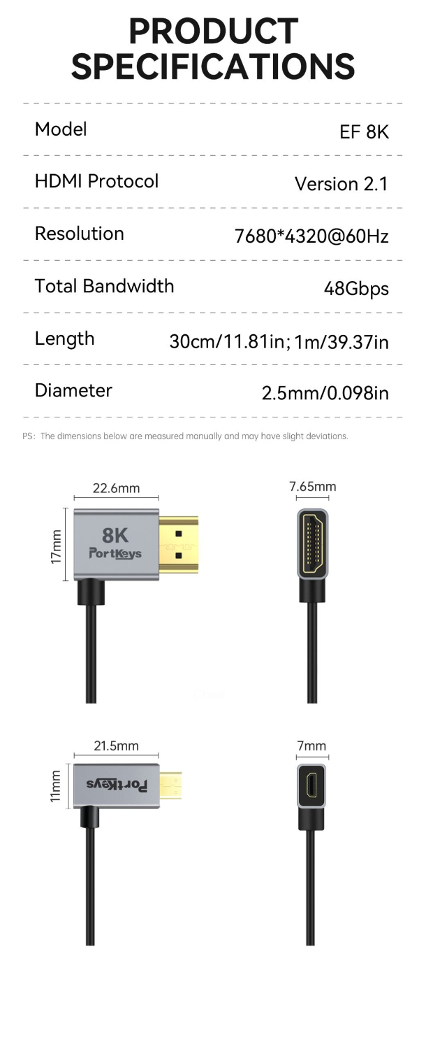 El cable Portkeys 8K HDMI (A a Micro HDMI D) de 1 m es un cable de alta gama diseñado para una transmisión de vídeo de alto rendimiento. Está diseñado para admitir una resolución de 8K, ofrece una nitidez y un nivel de detalle excepcionales, y garantiza una salida de vídeo de nivel profesional. El cable cuenta con un conector HDMI tipo A estándar en un extremo y un conector Micro HDMI tipo D en el otro, por lo que es compatible con una amplia gama de cámaras, monitores y otros dispositivos con interfaz HDMI.