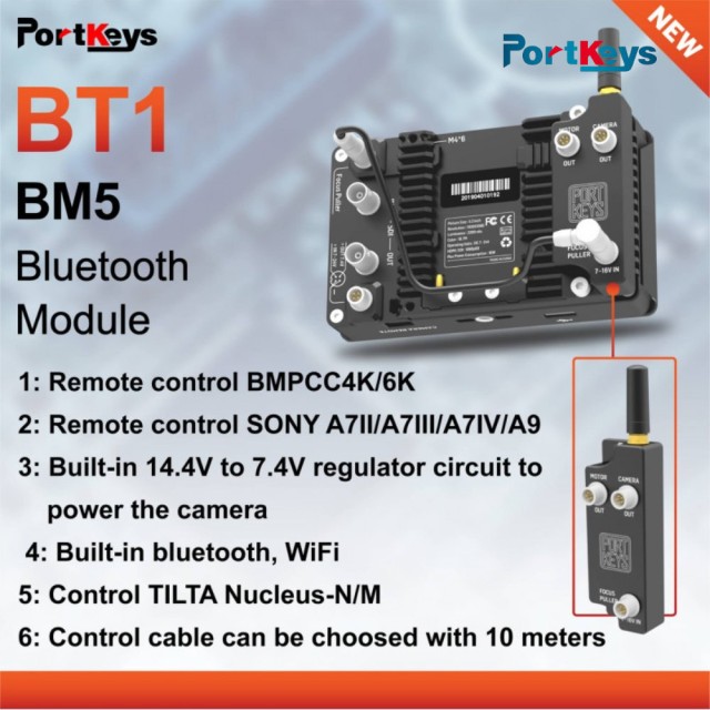 Módulo Bluetooth opcional para los monitores BM5 I y II que permite el control remoto de las cámaras BMPCC4K/6K (de forma inalámbrica) y Sony A7II / A7III / A7IV (por cable). Se pueden controlar (dependiendo de la cámara), por ejemplo, la grabación, la apertura, el ISO, el obturador, el zoom, el enfoque, la exposición automática, el balance de blancos y los ajustes de resolución/fps/códec.
