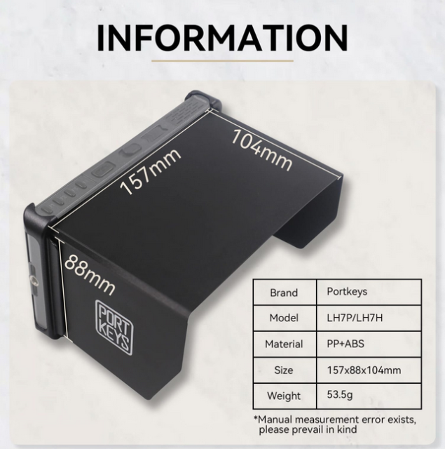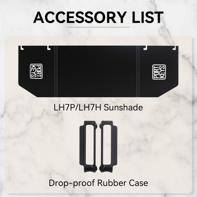 El parasol Portkeys LH7P/LH7H es un parasol ligero y plegable diseñado para proteger los monitores de exterior LH7P y LH7H de 7 pulgadas contra los reflejos y la luz solar, garantizando así una visibilidad nítida durante las grabaciones en exteriores. Está fabricada con un material resistente de PP+ABS, pesa solo 53,5 g y tiene unas dimensiones compactas de 157 × 88 × 104 mm. Se instala fácilmente y se mantiene en su sitio de forma segura. El paquete también incluye una funda de goma resistente a las caídas, que proporciona una protección adicional durante el transporte.