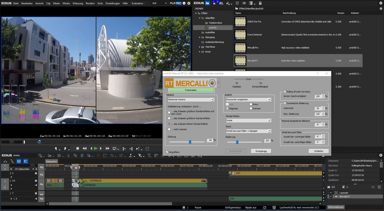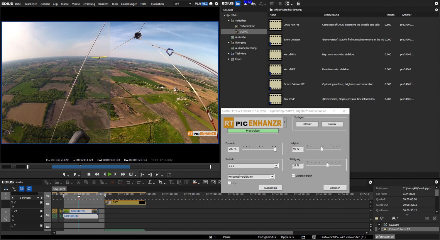 Con la nueva versión del programa/complemento de estabilización ProDAD Mercalli, ya no es necesario el tedioso proceso de análisis de imagen. El nuevo complemento Mercalli RT funciona en tiempo real y permite ajustar el grado de estabilización y recortar o ampliar la imagen. También es nuevo el complemento Picture Enhanzr, que permite ajustar de forma automática (y manual) el color, el contraste y el brillo de la imagen. Para reducir la distorsión extrema de la imagen causada por la lectura por líneas de los sensores de imagen (rolling shutter) se utiliza la herramienta CMOS FIXR Pro. Los complementos ofrecen aceleración mediante GPU y multithreading (hasta 256 núcleos) y son compatibles con la resolución 4K.