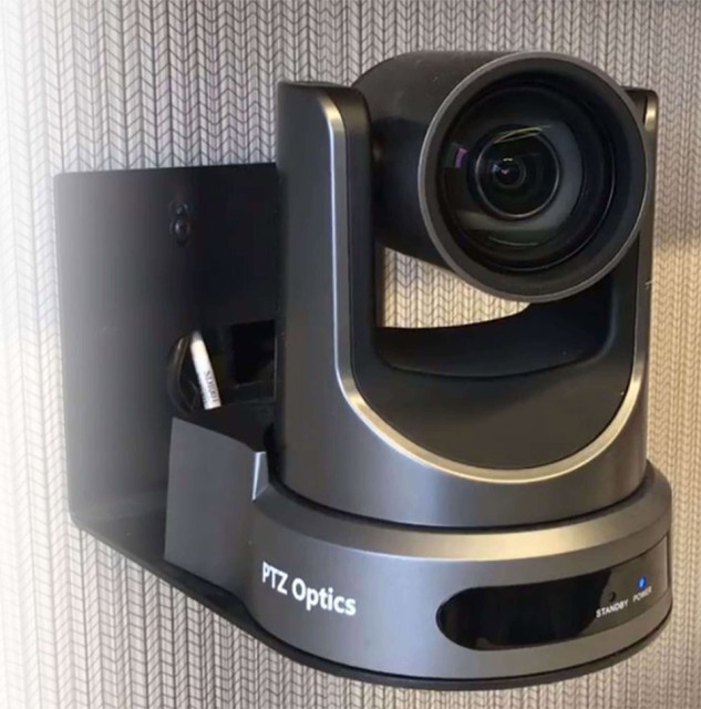 Soporte metálico de pared para la cámara PTZ PTZOptics PT30X-SE-WH-G3. El soporte es de color blanco.