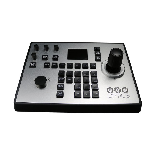 El PT-JOY-G4 es un controlador IP/serial de cuarta generación de PTZOptics. Permite controlar hasta 255 cámaras a través de IP y 7 cámaras mediante protocolos seriales compatibles con VISCA, VISCA-over-IP, Pelco-P y Pelco-D a través de IP o RS-232, RS-422 y RS-485. Permite controlar el giro, la inclinación, el zoom y las posiciones preestablecidas.