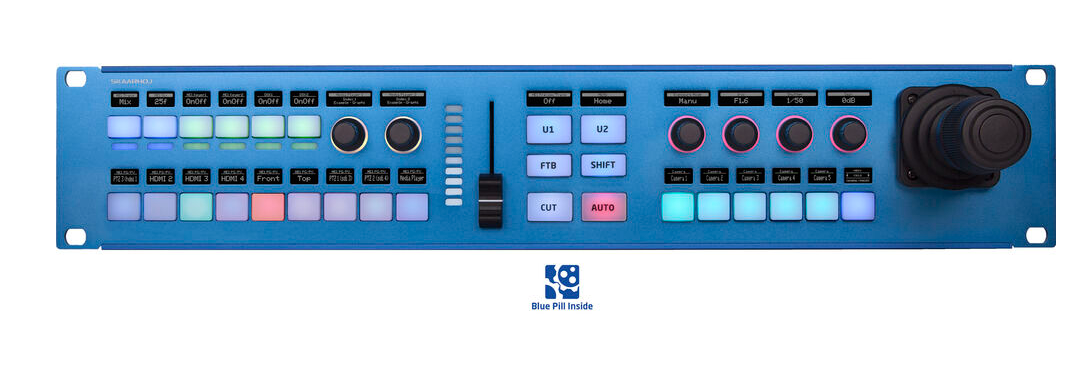 El SKAARHOJ Rack Fusion Live, con joystick de efecto Hall y Blue Pill integrado, es un conmutador de cámaras PTZ y una superficie de control montable en rack que cuenta con un joystick de efecto Hall, controles con etiquetas OLED y el sistema operativo skaarOS integrado para flujos de trabajo avanzados de producción en directo basados en IP.