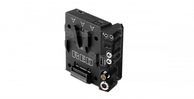 El DSMC2 V-Lock I/O Expander cuenta con numerosas entradas y salidas estándar, así como con una ranura para baterías V-Lock que permite alimentar las cámaras de la serie DSMC2, por ejemplo, con baterías RED BRICK. El módulo, fabricado en una aleación de magnesio resistente y ligera, se conecta a la parte trasera de la cámara y ofrece una entrada de alimentación (DC IN), una salida HDMI 1.2 (Tipo A), una salida 3G-SDI (HD-SDI, BNC, impedancia de 75 ohmios), puertos CTRL y SYNC (2 conectores LEMO de cuatro pines 00B con soporte para código de tiempo y señal genlock), una salida de alimentación AUX Power (conector hembra P-Tap de dos pines), salida de alimentación por bus USB (Tipo A, 5 V con un consumo de 1,5 mA, p. ej., para alimentar transmisores HDMI o pequeños dispositivos móviles), salida de auriculares de 3,5 mm y salida de línea estéreo, también en conector jack de 3,5 mm. El módulo ofrece la posibilidad de arrancar automáticamente la cámara tras conectar la alimentación a la entrada DC IN. Esta función permite encender y apagar fácilmente la cámara sin necesidad de manipular físicamente el cuerpo de la misma. Nota: El asa superior DSMC2 Top Handle no es totalmente compatible con este módulo si también hay una batería conectada. Compatibilidad: WEAPON, SCARLET-W, RAVEN.