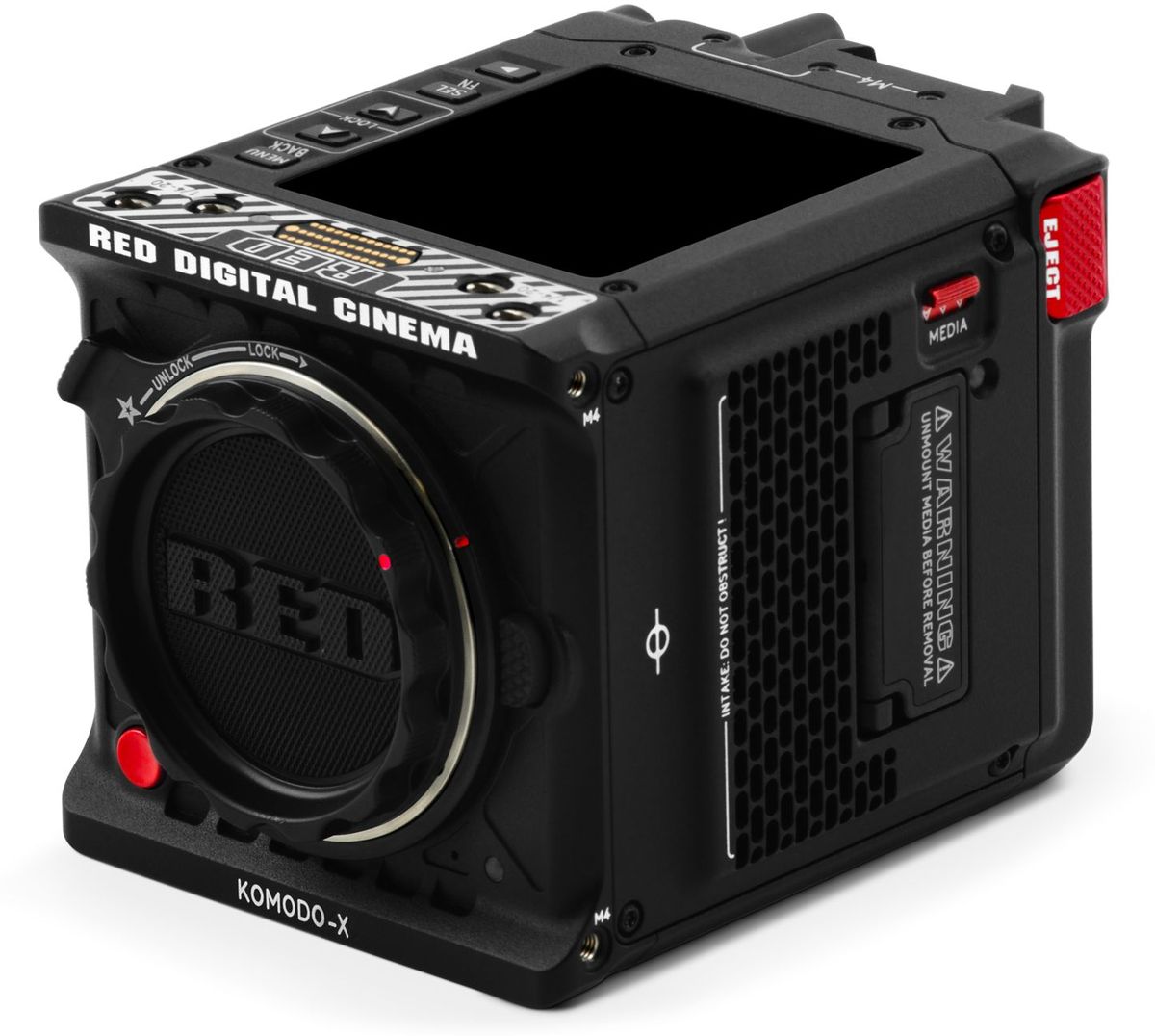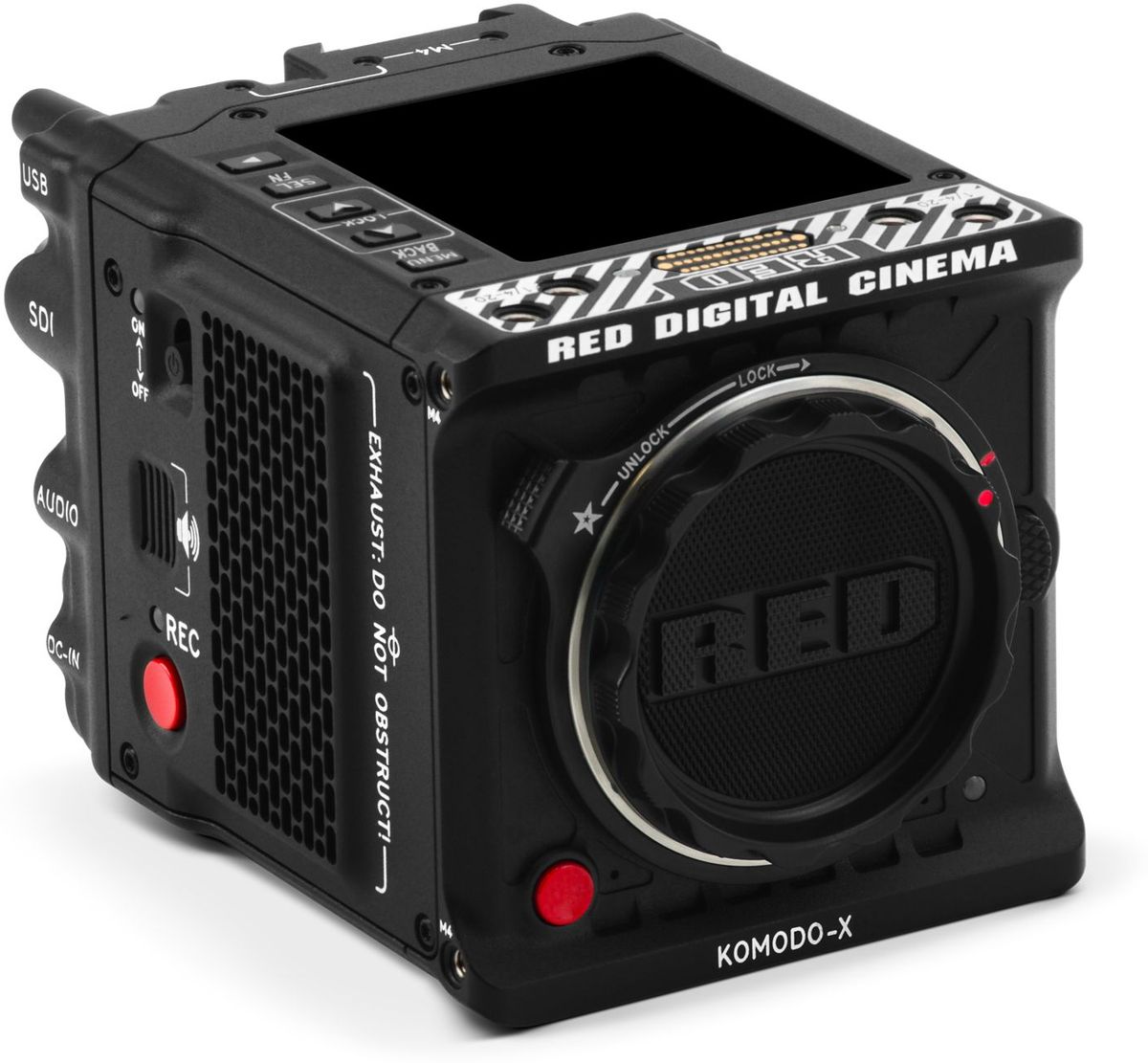 Gracias a estas innovaciones, la Komodo-X resulta más fácil de utilizar en producciones cinematográficas de alta gama, al tiempo que conserva las dimensiones compactas del modelo Komodo. Entre las nuevas interfaces se incluyen 12G-SDI, una entrada de alimentación de tamaño completo, un puerto USB-C y un conector de audio con bloqueo de seguridad y compatibilidad con alimentación fantasma. La pantalla LCD integrada de 2,9" facilita el control y la visualización del vídeo; para una visualización precisa, se puede utilizar el monitor opcional RED DSMC3 Touch LCD de 7".