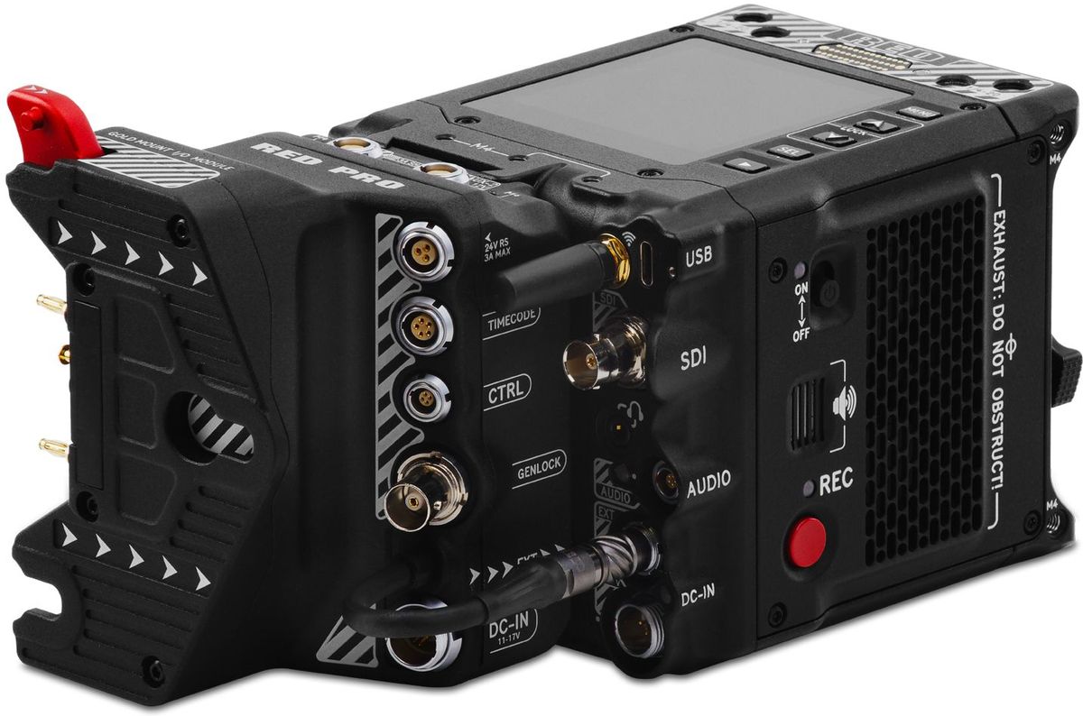 El módulo adicional RED Pro I/O Gold Mount Module amplía las entradas y salidas de las cámaras RED Komodo-X y RED V-Raptor, además de añadirles compatibilidad con baterías estándar de tipo Gold Mount. El módulo se conecta directamente a la placa Micro V-Lock situada en la parte trasera de la cámara y al puerto Ext Port de 9 pines, y ofrece lo siguiente: