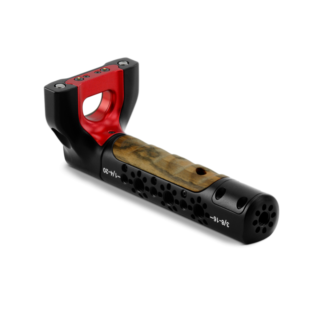 La empuñadura superior V-RAPTOR® se acopla fácilmente a la parte superior del cuerpo de la cámara V-RAPTOR® y ofrece una combinación de comodidad y practicidad a la hora de transportar la cámara o tomar fotografías. Esta empuñadura superior mecanizada está equipada con inserciones ergonómicas de madera de bocote y cuenta con un control para el disparador de la cámara. Si se utiliza con el kit de extensión de la empuñadura superior, también se puede configurar de diversas formas e incluye varias roscas de 1/4-20 y 3/8-16.