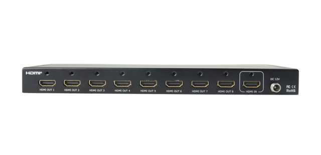 El RGBlink DXP H0108 es un distribuidor de vídeo HDMI 2.0 profesional que recibe una entrada HDMI y la distribuye simultáneamente a ocho salidas HDMI. Admite resoluciones de hasta 4096×2160 a 60 Hz, es compatible con HDR y HDCP 2.2, y garantiza una distribución de la señal de alta calidad sin pérdida de calidad para aplicaciones audiovisuales exigentes.