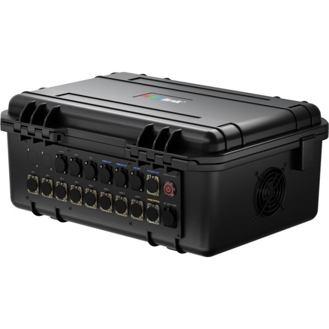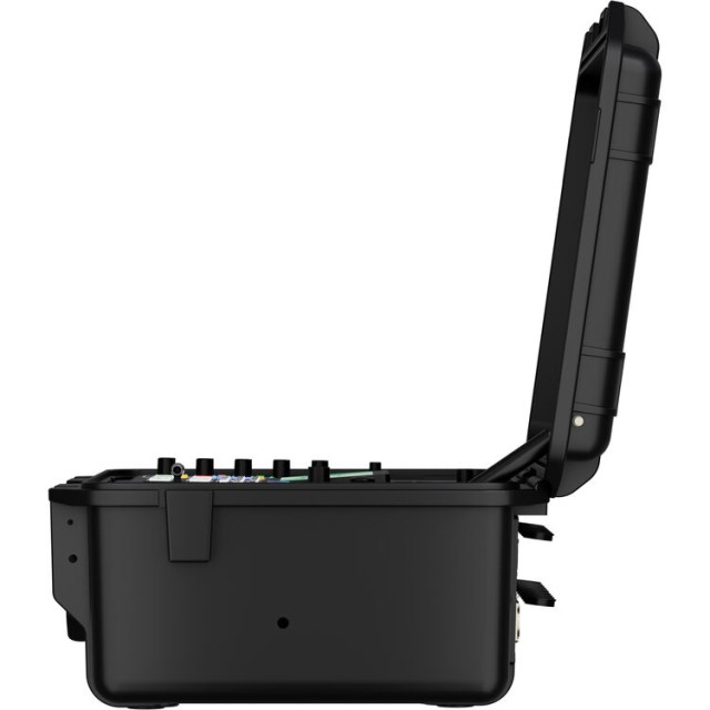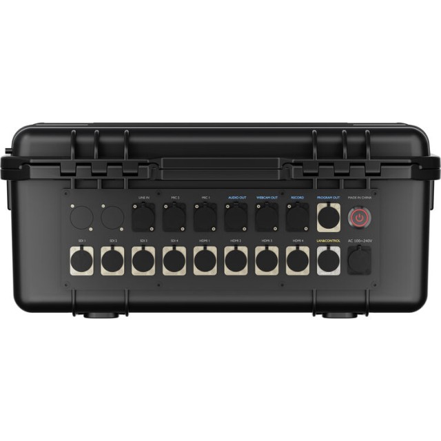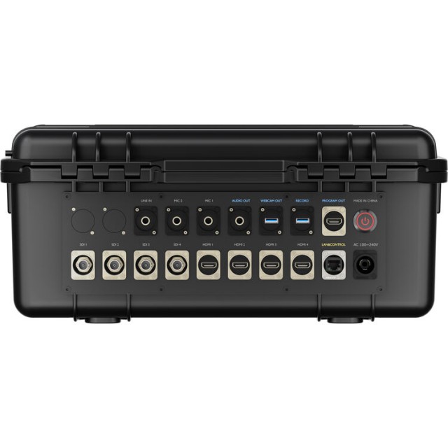 El conmutador está equipado con cuatro entradas HDMI 2.0 y cuatro entradas 3G-SDI, admite una amplia gama de resoluciones hasta formatos de entrada 4K, mientras que el procesamiento se realiza hasta una resolución de 1080p. La gran pantalla TFT IPS Full HD de 14" integrada en la tapa del maletín permite ver con claridad múltiples imágenes, previsualizar y controlar sin necesidad de pantallas externas.