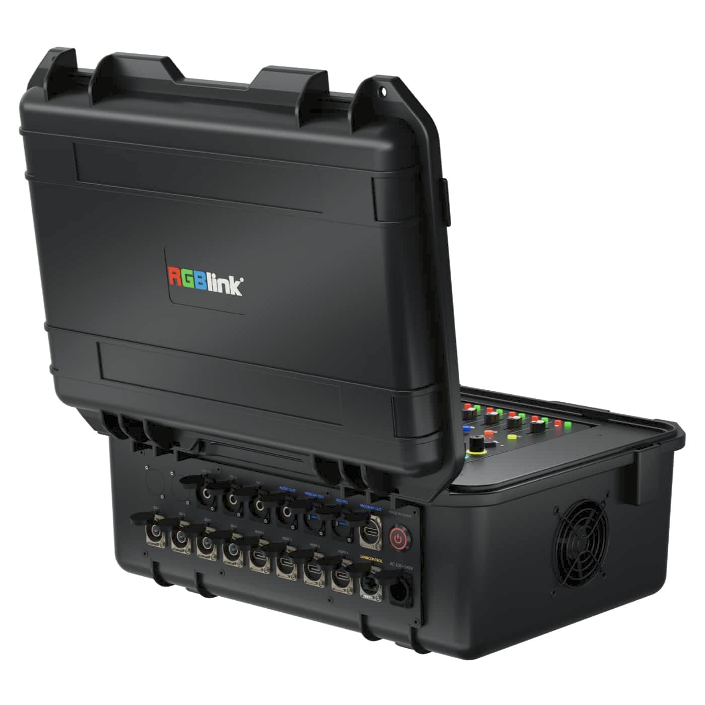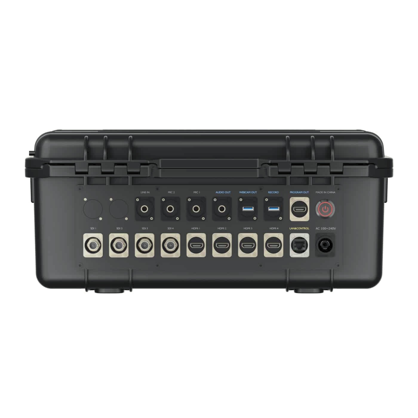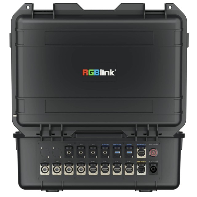 El RGBlink mini MX 4S es un conmutador «todo en uno»universal para la producción de vídeo, diseñado para retransmisiones en directo, emisiones de televisión y producción híbrida de eventos. Se presenta en una resistente maleta de PP con soporte hidráulico y un monitor IPS HD de 14″ integrado, y combina la portabilidad con una gran robustez. El dispositivo cuenta con un total de 10 entradas de vídeo, incluyendo 4 × HDMI 2.0, 4 × SDI, 1 × USB-C y 1 × entrada bidireccional NDI|HX2, lo que permite una integración flexible con cámaras, ordenadores y fuentes IP.