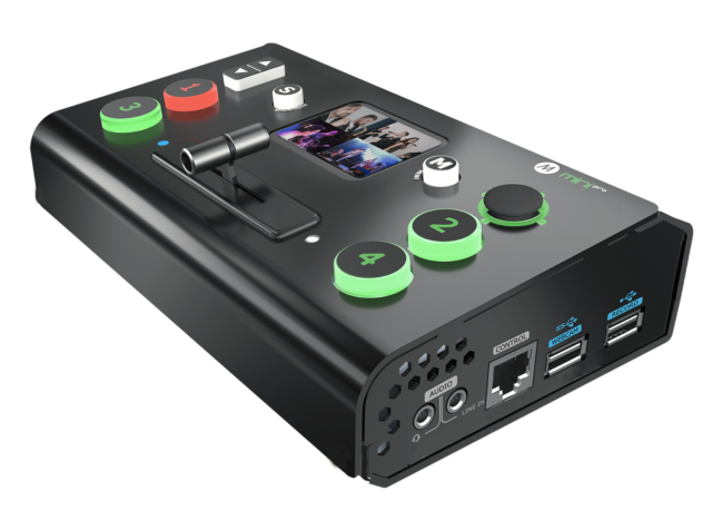 El Mini-pro 2022 está equipado con un clásico conmutador T-bar, un joystick para controlar la cámara con soporte VISCA PTZ y 14 efectos de transición, lo que hace que la conmutación en directo sea fluida e intuitiva. Admite la retransmisión en directo a través de USB 3.0, siendo reconocido por las plataformas más populares como una cámara web, y la grabación a través de USB 2.0 directamente en un dispositivo de almacenamiento FAT32 o exFAT (hasta 2 TB). El procesamiento avanzado del audio permite mezclar el audio HDMI integrado con entradas de audio externas y mantiene la sincronización entre audio y vídeo con un retardo ajustable.