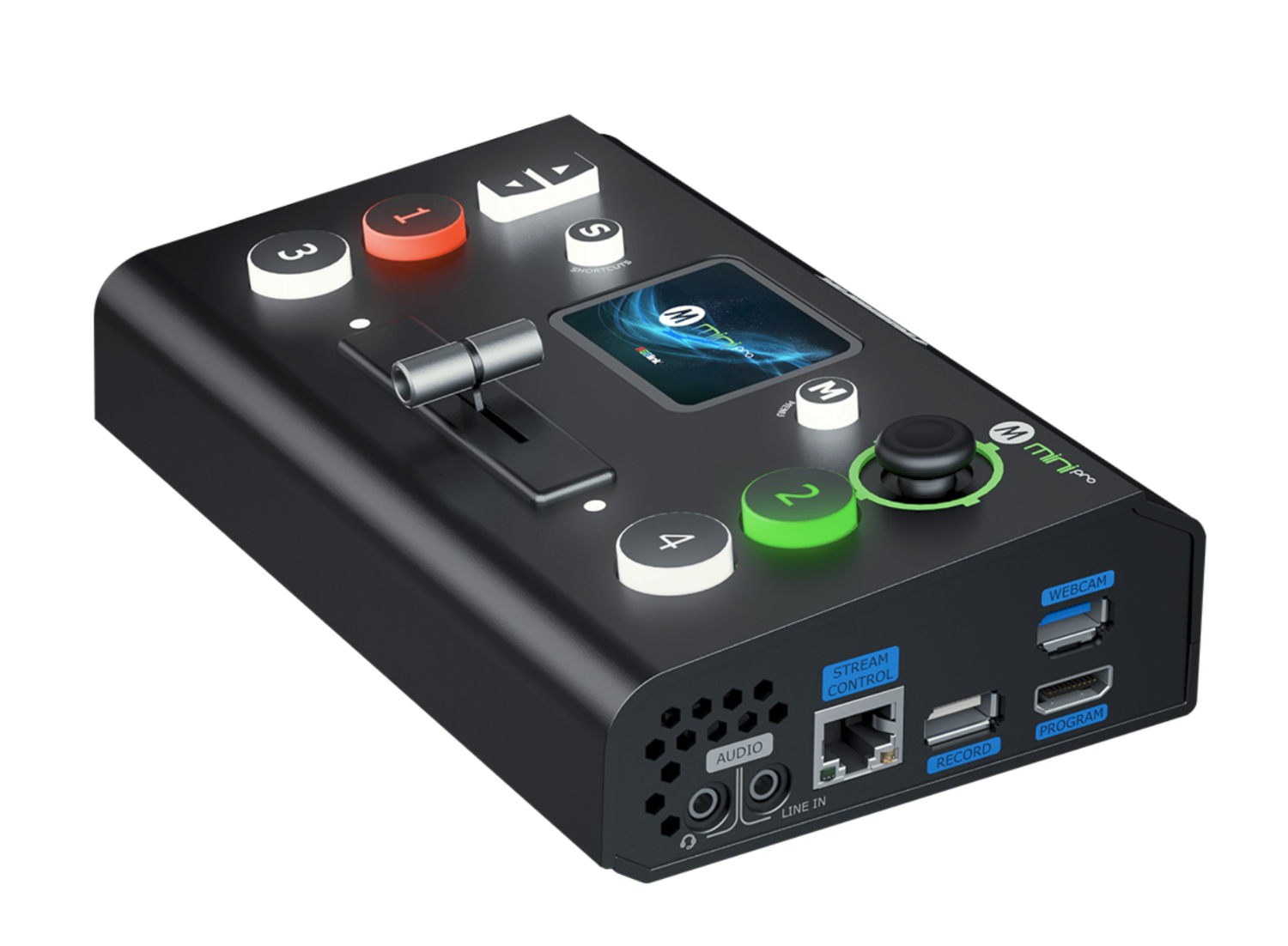 La pantalla táctil IPS en color de 2,1 pulgadas integrada ofrece una navegación intuitiva por los menús mediante iconos para la monitorización de la señal, la conmutación y el control de efectos. La pantalla táctil se complementa con un joystick clásico de cinco direcciones y un selector que permiten un control fluido de las transiciones, PIP, croma, edición de capas y control de la cámara PTZ a través de IP VISCA, incluyendo el almacenamiento y la recuperación de preselecciones PTZ con un solo clic.