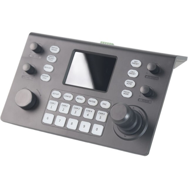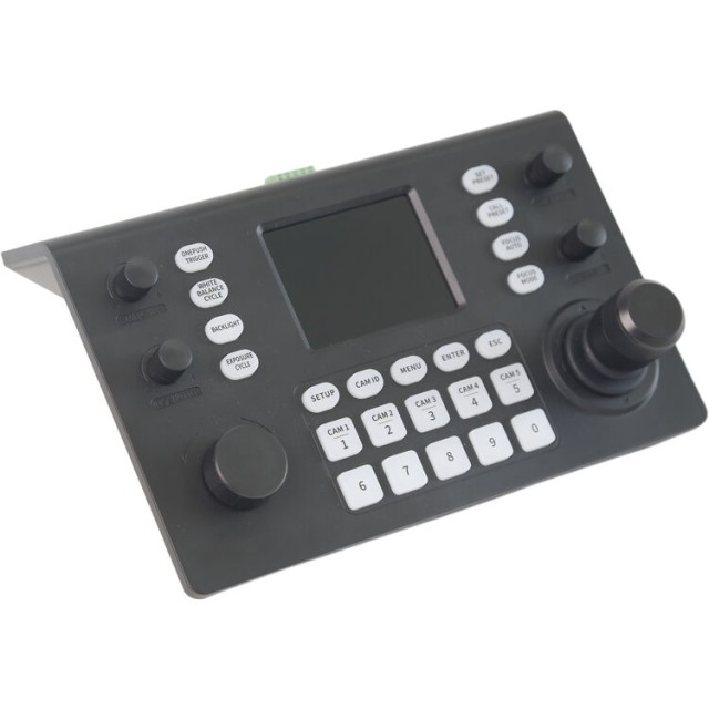 El RGBlink RGBBKT es un controlador profesional para cámaras PTZ diseñado para el control preciso y eficaz de grandes sistemas de cámaras basados en la tecnología NDI. Está equipado con una pantalla nítida de 3,5", un joystick con efecto Hall y controles específicos para el enfoque, la apertura y el zoom. Permite el funcionamiento fluido de hasta 255 cámaras en tiempo real en una sola red IP con soporte PoE.