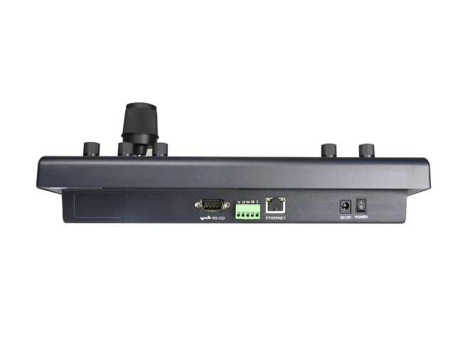El controlador de cámaras PTZ RGBlink permite controlar hasta 255 cámaras a través de conexiones Ethernet y serie. Es compatible con los protocolos ONVIF, VISCA, Pelco-D y Pelco-P. El joystick, los botones giratorios y los controles del teclado permiten al usuario cambiar rápidamente entre cámaras PTZ y ajustar los parámetros. En el panel frontal hay una pantalla LCD con respuesta sonora de las teclas.