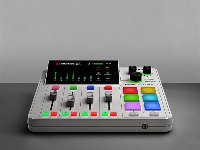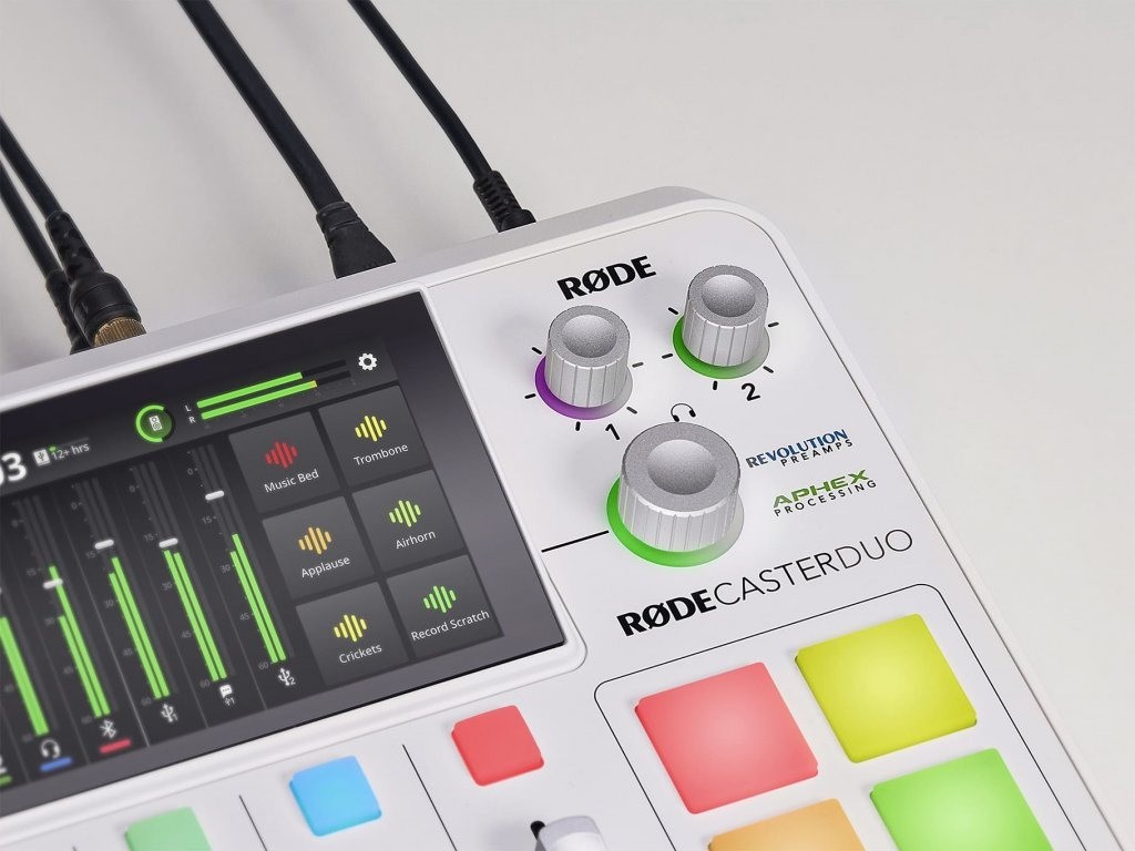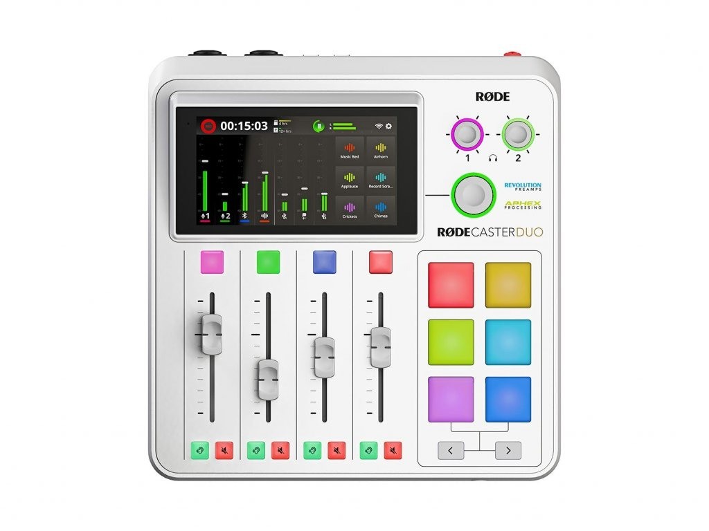 El RØDECaster Duo (blanco) es una herramienta de trabajo compacta y extremadamente potente, de tipo «todo en uno», pensada para creadores de podcasts y contenidos, para retransmisiones sencillas y para cualquier tipo de comunicación en línea.