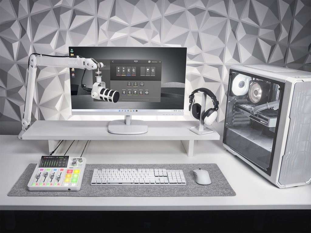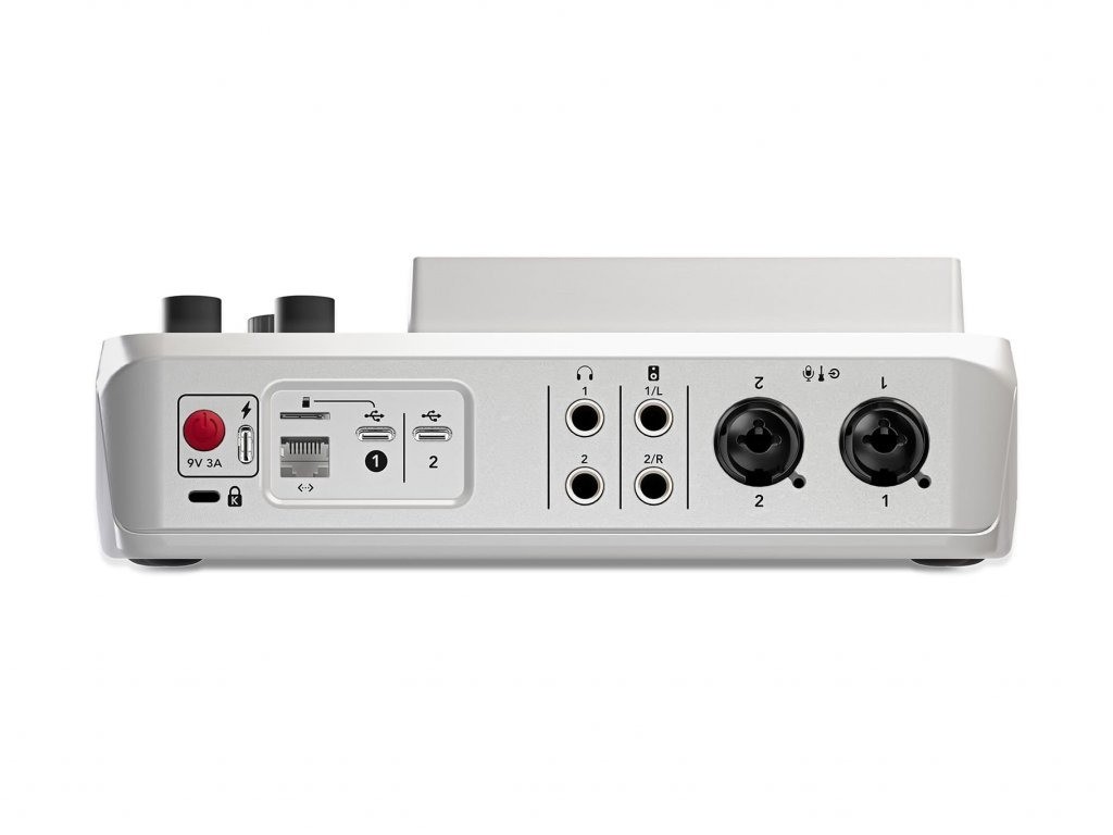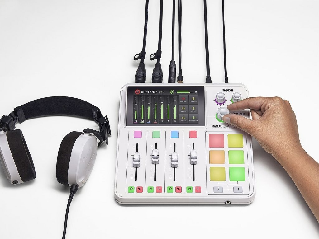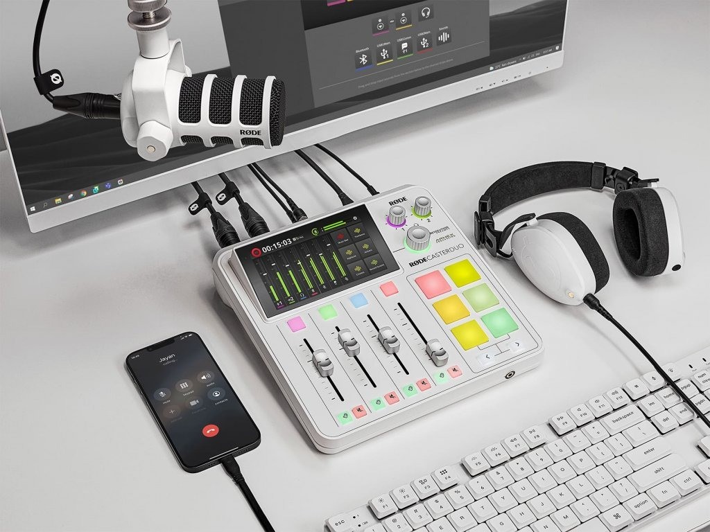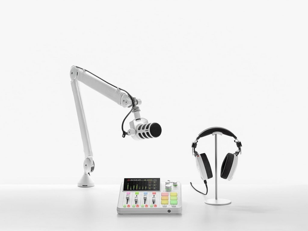 Mezclador de estudio compacto para podcasts y streaming, 2 entradas analógicas (micrófono/línea/instrumento), 2 salidas de auriculares, 1 entrada para auriculares con micrófono, salida para monitores de audio, 2 puertos USB-C, Wi-Fi, Ethernet, Bluetooth®, receptor para RØDE wireless, 4 faders físicos y 3 virtuales, pantalla LCD de 5,5", procesadores APHEX®, efectos RØDE FX, color blanco