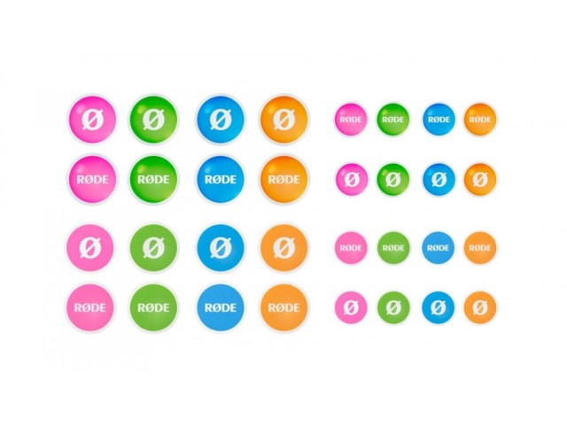 RODE COLORS 2 es un conjunto de cuatro filtros antipop de colores, anillos identificativos para cables, pegatinas y una etiqueta para determinados micrófonos RØDE.