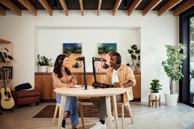 Este kit de podcast a precio reducido para 1-4 personas combina el estudio de producción RØDECaster con micrófonos profesionales, auriculares, soportes de estudio y accesorios. Puedes personalizar el kit según el número de participantes y la combinación de colores. Ideal para podcasts en solitario, entrevistas y grabaciones en equipo.