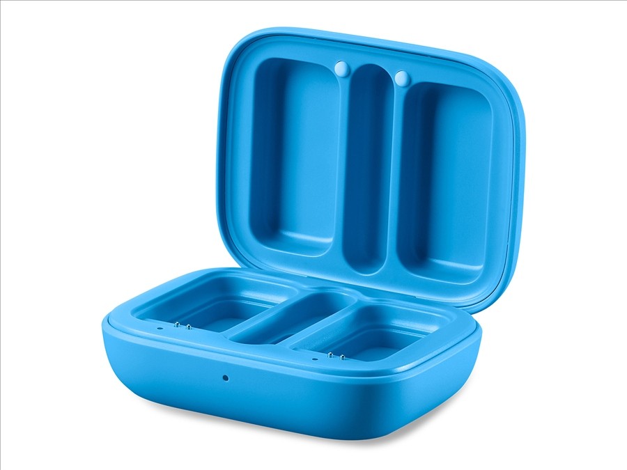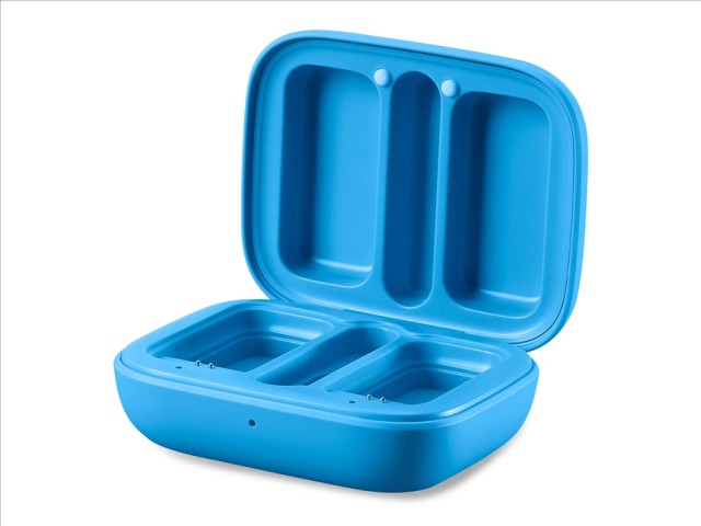 base de recarga que garantiza la recarga de los transmisores durante el transporte o las pausas de grabación. Se puede alimentar mediante el cable USB-C incluido, o bien puede utilizarla batería interna, que permite realizardos recargas completasde todos los componentes del kit.