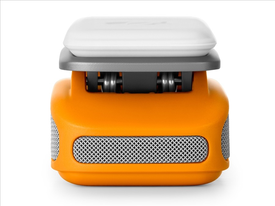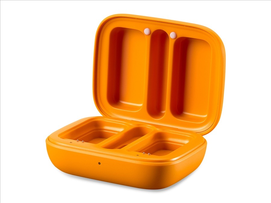 base de recarga que garantiza la recarga de los transmisores durante el transporte o las pausas de grabación. Se puede alimentar mediante el cable USB-C incluido, o bien puede utilizarla batería interna, que permite realizardos recargas completasde todos los componentes del kit.