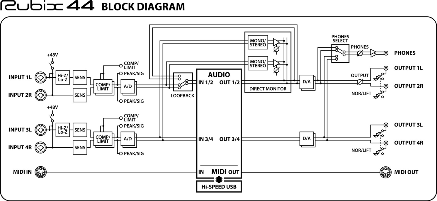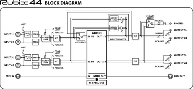 Las fuentes altamente dinámicas, como los instrumentos de percusión, suelen requerir un control del nivel mediante el procesamiento dinámico. También es habitual utilizar la compresión de voces y bajos durante la grabación para equilibrar los niveles y que estas fuentes se mezclen mejor. El Rubix44 está equipado con compresores/limitadores accesibles desde el panel en las entradas 1/2 y 3/4, que garantizan señales de alta calidad y potentes sin clipping ni distorsión indeseada. El procesamiento dinámico es totalmente analógico, lo que garantiza un control fluido y transparente sin latencia añadida.