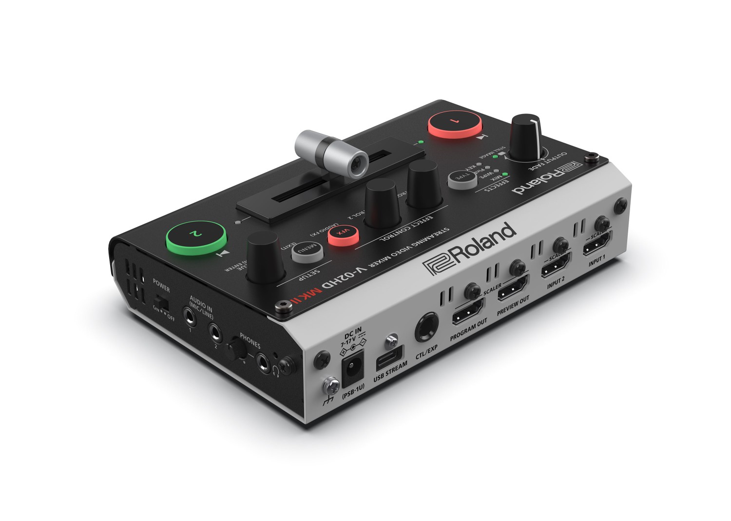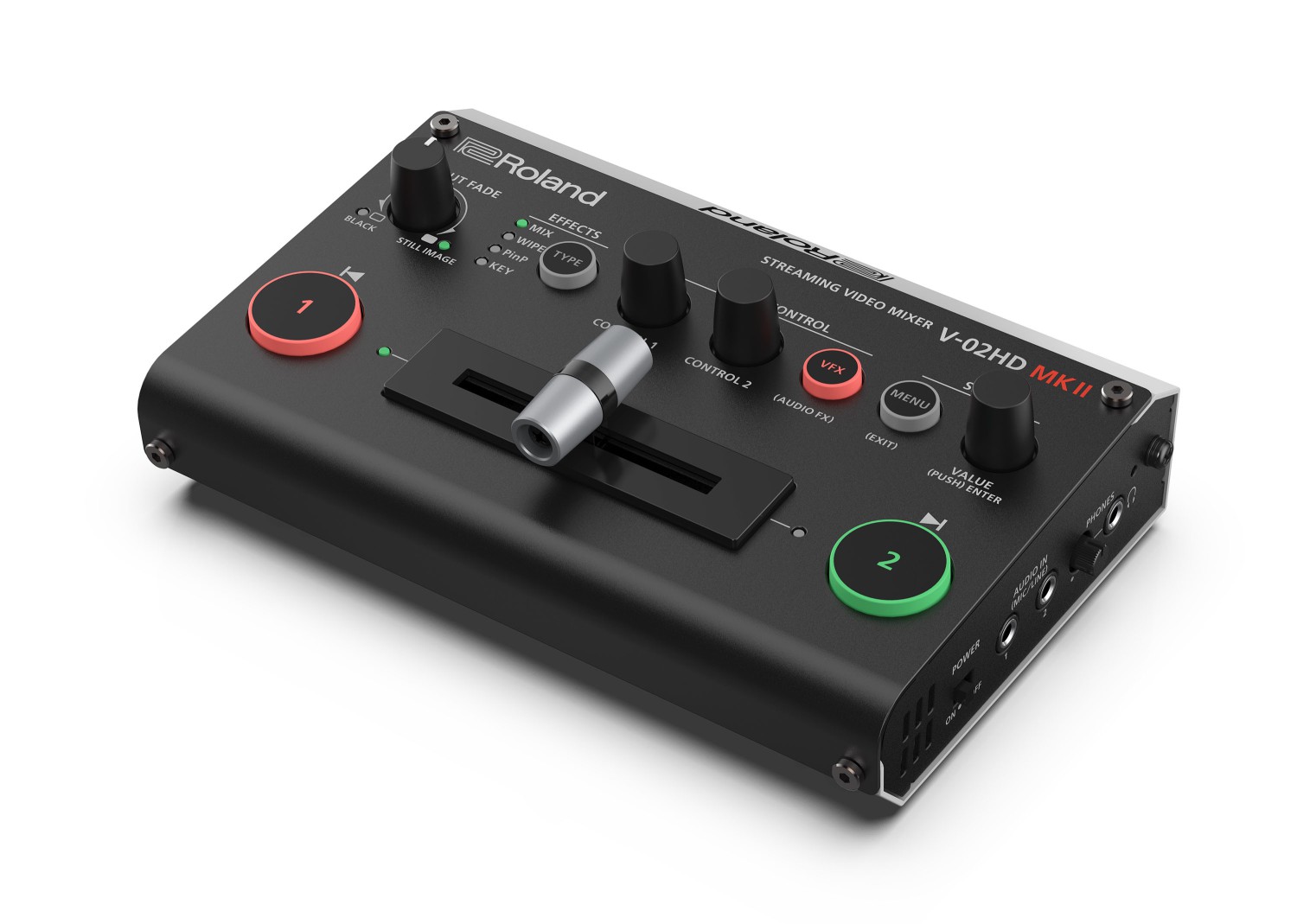 ¡La minúscula mesa de regidor y dispositivo de streaming de dos canales Roland V-02HD MK II simplifica al máximo la producción de programas en directo con dos cámaras con salida HDMI y el streaming mediante un ordenador con interfaz USB-C! No falta la posibilidad de añadir audio a los programas (mesa virtual integrada de 10 canales, 2 entradas jack de 3,5 mm + alimentación por conector, audio HDMI...), aplicar efectos y fundidos, o la posibilidad de controlarlo mediante pedales BOSS (opcionales).