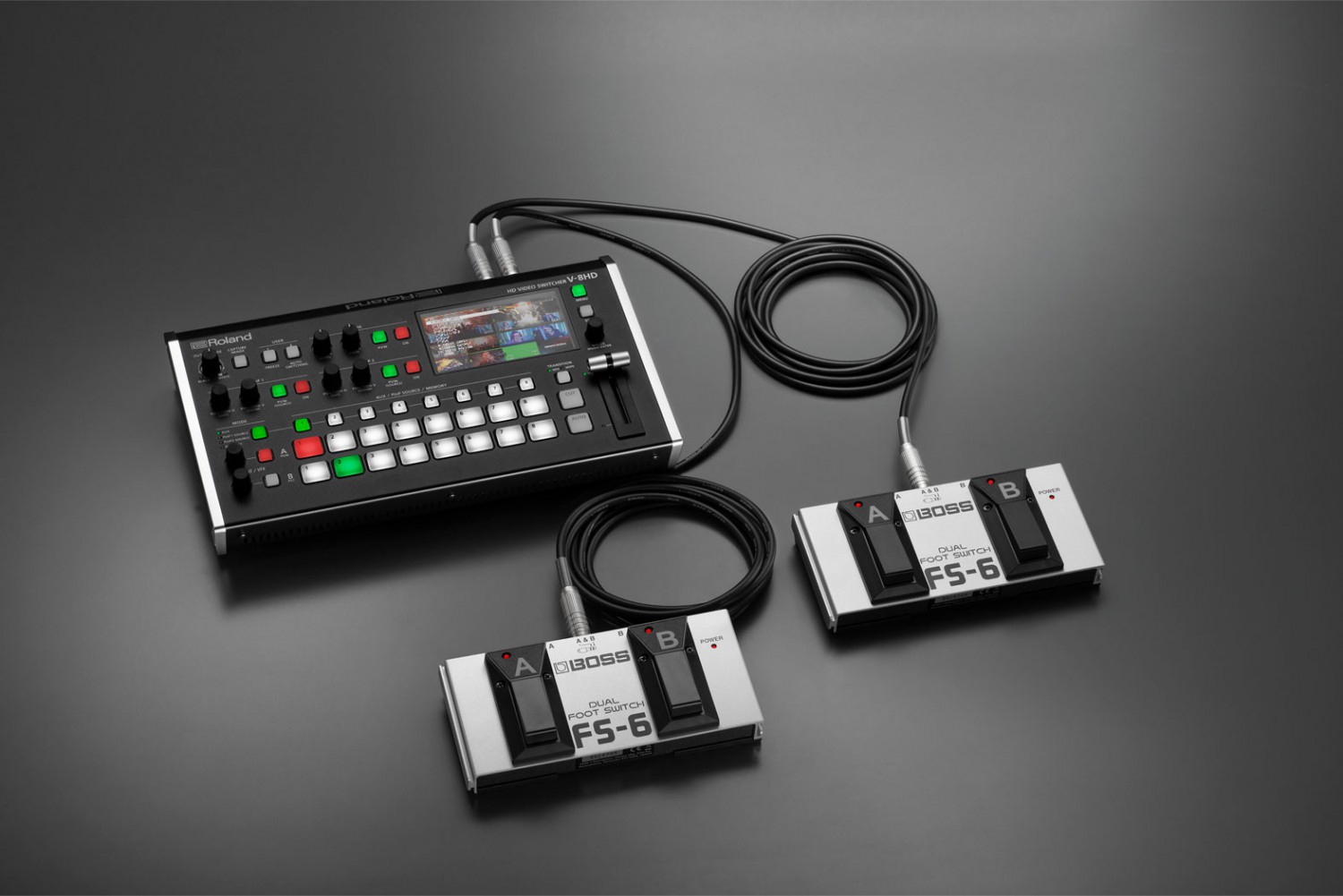 Pisa el pedal simple o doble de BOSS y ejecuta más de 100 comandos de conmutación diferentes. Corte a imagen fija, transición PIP hacia y desde la pantalla o activación de un título en el tercio inferior con croma. También es posible cambiar la salida auxiliar entre las notas del presentador y los mensajes del director de escena, activar/desactivar el modo de conmutación automática y mucho más.
