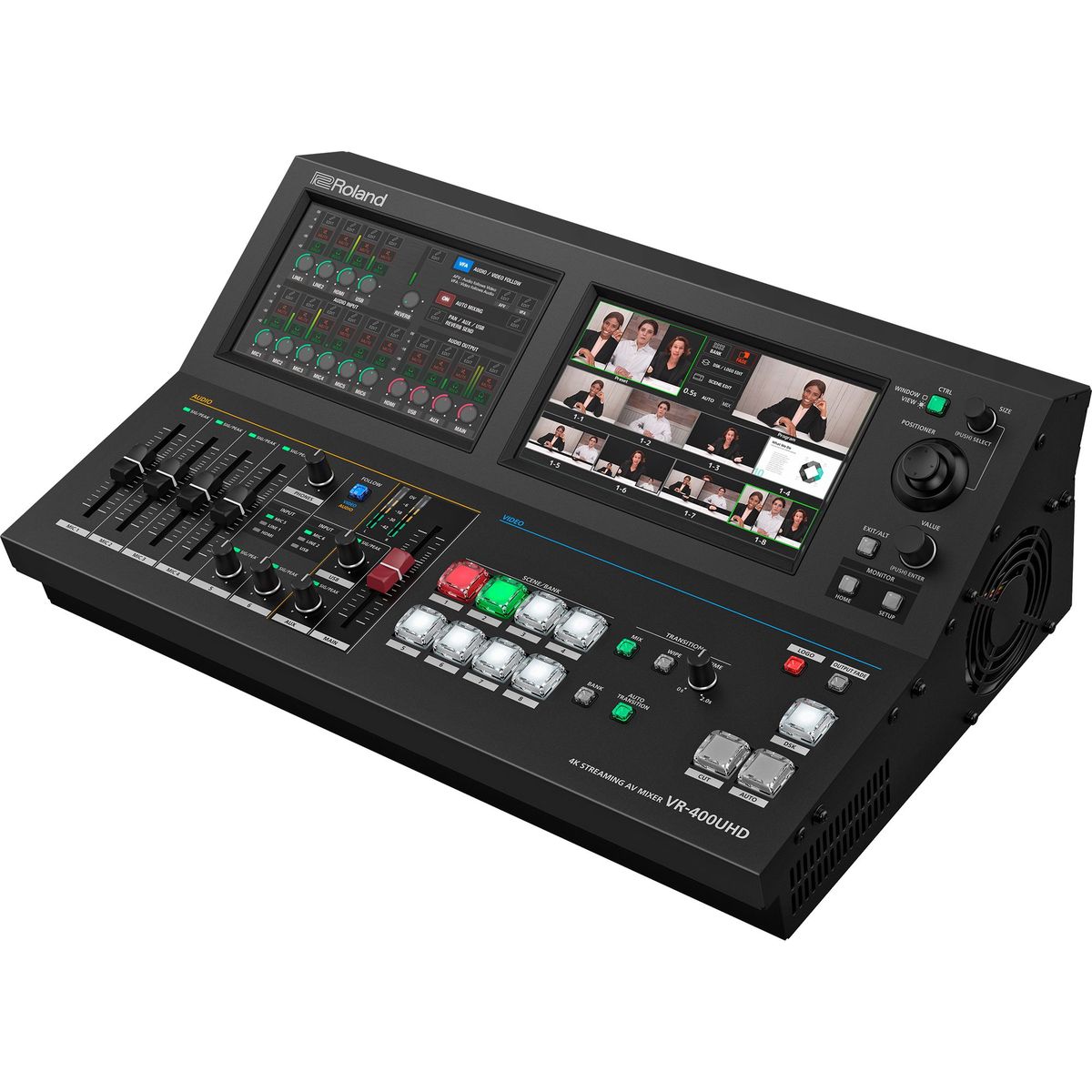 La potente consola VR-400UHD ofrece un panel de control integrado que incluye dos pantallas táctiles para gestionar con la máxima comodidad programas exigentes transmitidos en directo. Las pantallas muestran una vista previa del vídeo, las funciones de la mesa de mezclas de audio, los ajustes de los efectos de transición, etc. Las entradas HDMI admiten vídeo de hasta 4Kp60/FHD y los formatos Rec.2020/Rec.709; la salida USB-C en modo cámara web transmite vídeo de hasta 4K/30 fps (USB 3.2 Gen 2, 10 Gb/s).