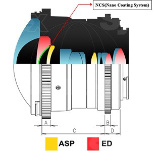 La construcción de este objetivo consta de 12 elementos distribuidos en 8 grupos, entre los que se incluyen 2 elementos asféricos (ASP) y 3 lentes de dispersión ultrabaja (ED), con el fin de ofrecer la máxima resolución posible. Se ha aplicado el tratamiento superficial Nano Coating System (NCS) para optimizar la transmisión de la luz y reducir los destellos y las sombras no deseados. Gracias a este diseño óptico, cuenta con una distancia mínima de enfoque de 0,2 m para capturar sujetos a muy corta distancia