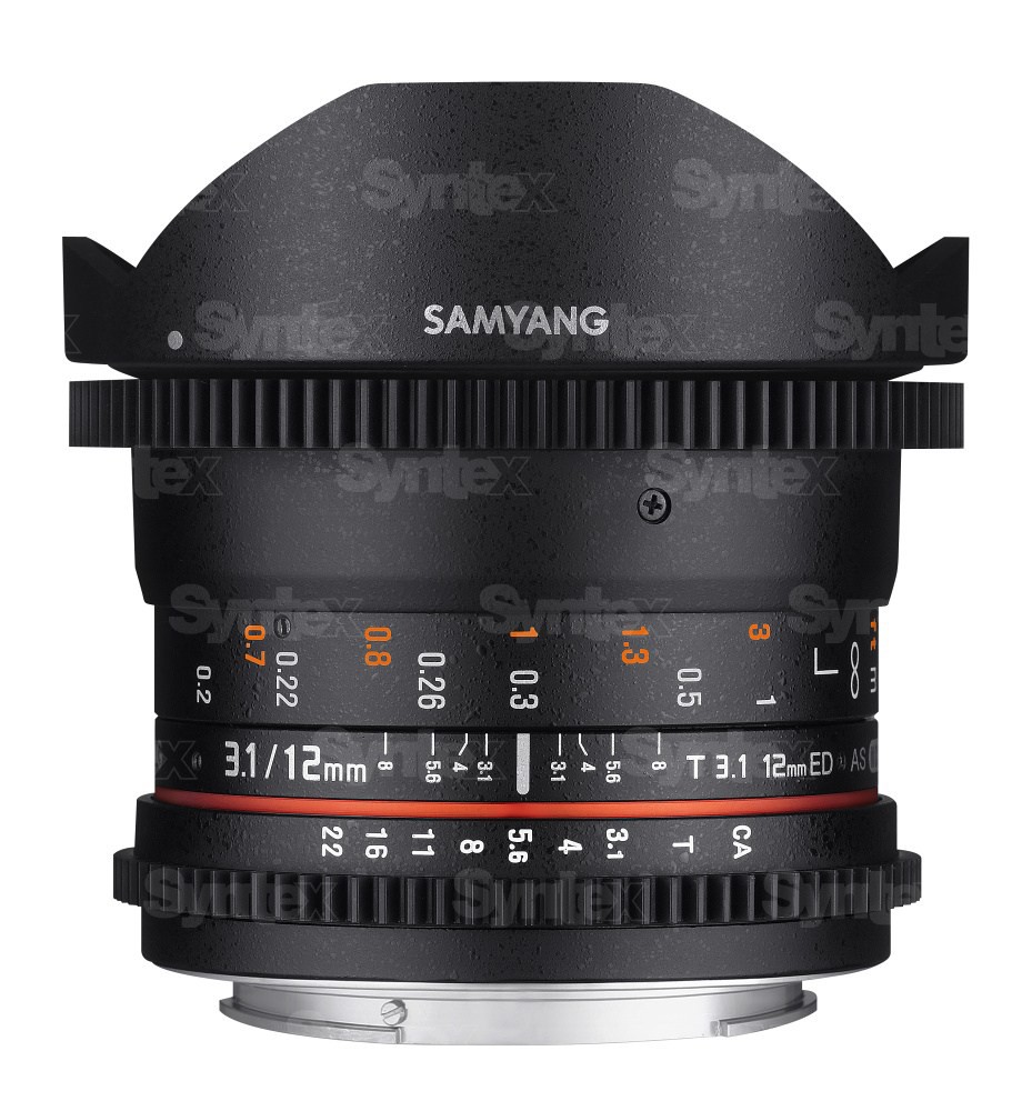 El Samyang 12 mm T3.1 VDSLR ED AS NCS FISH-EYE es uno de los objetivos que componen el kit Samyang VDSLR. Estos objetivos reproducen el mismo color de imagen y tienen una posición uniforme del diafragma y del anillo de enfoque con el fin de garantizar la máxima comodidad durante la grabación.