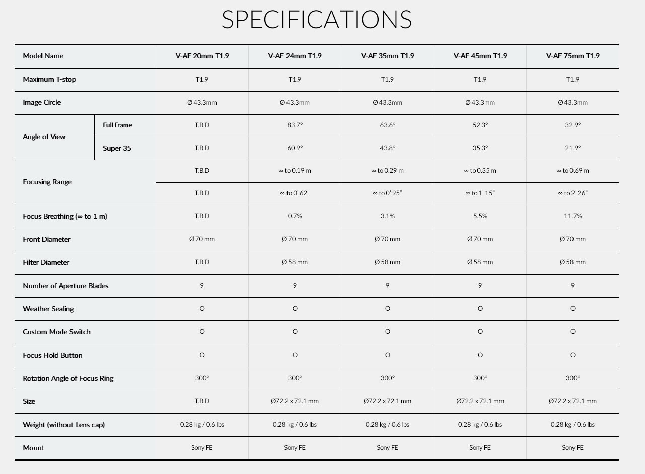 La gama de objetivos AF para cine Samyang V-AF se centra en ofrecer una alta calidad de imagen al tiempo que minimiza las dimensiones y el peso del cuerpo (<300 g) para facilitar al máximo su uso con estabilizadores de cámara y drones. La serie ofrece varias distancias focales fijas (20, 24, 35, 45, 75, 100) con las mismas dimensiones y una gama de colores coordinada, un anillo de enfoque dentado y un diafragma de 9 láminas para una reproducción natural de la imagen fuera del plano de enfoque. El modelo 100 mm T2.3 FE se desmarca ligeramente de la gama por su longitud y su apertura T/2,3. Los objetivos Samyang V-AF proporcionan una resolución óptica muy buena, adecuada para dispositivos con sensores de hasta 4K y 8K; otro detalle interesante es el par de LED que indican que se está grabando, lo que facilita aún más el uso de los objetivos en estabilizadores, etc. El botón «Focus Save» sirve para bloquear el ajuste de enfoque durante el funcionamiento del AF, mientras que el interruptor integrado «Custom Switch» puede utilizarse, por ejemplo, para cambiar la función del anillo de enfoque a ajuste de diafragma en el modo AF. A la venta a partir de noviembre de 2022.