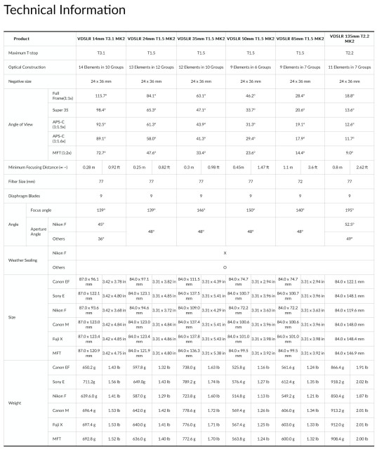 La serie VDSLR MK2 incluye seis modelos con distancias focales de uso habitual: 14 mm T3,1, 24 mm T1,5, 35 mm T1,5, 50 mm T1,5, 85 mm T1,5 y 135 mm T2,2, para seis tipos de monturas: Canon EF, Sony E, Nikon F, Canon M, Fuji X y MFT. Todos los objetivos de la gama ofrecen una construcción óptica de alta calidad que utiliza lentes ASP o ED para reducir las aberraciones y proporcionar una imagen nítida y clara. Gracias al nuevo diafragma de nueve láminas, también producen una imagen de calidad incluso fuera del plano de enfoque.