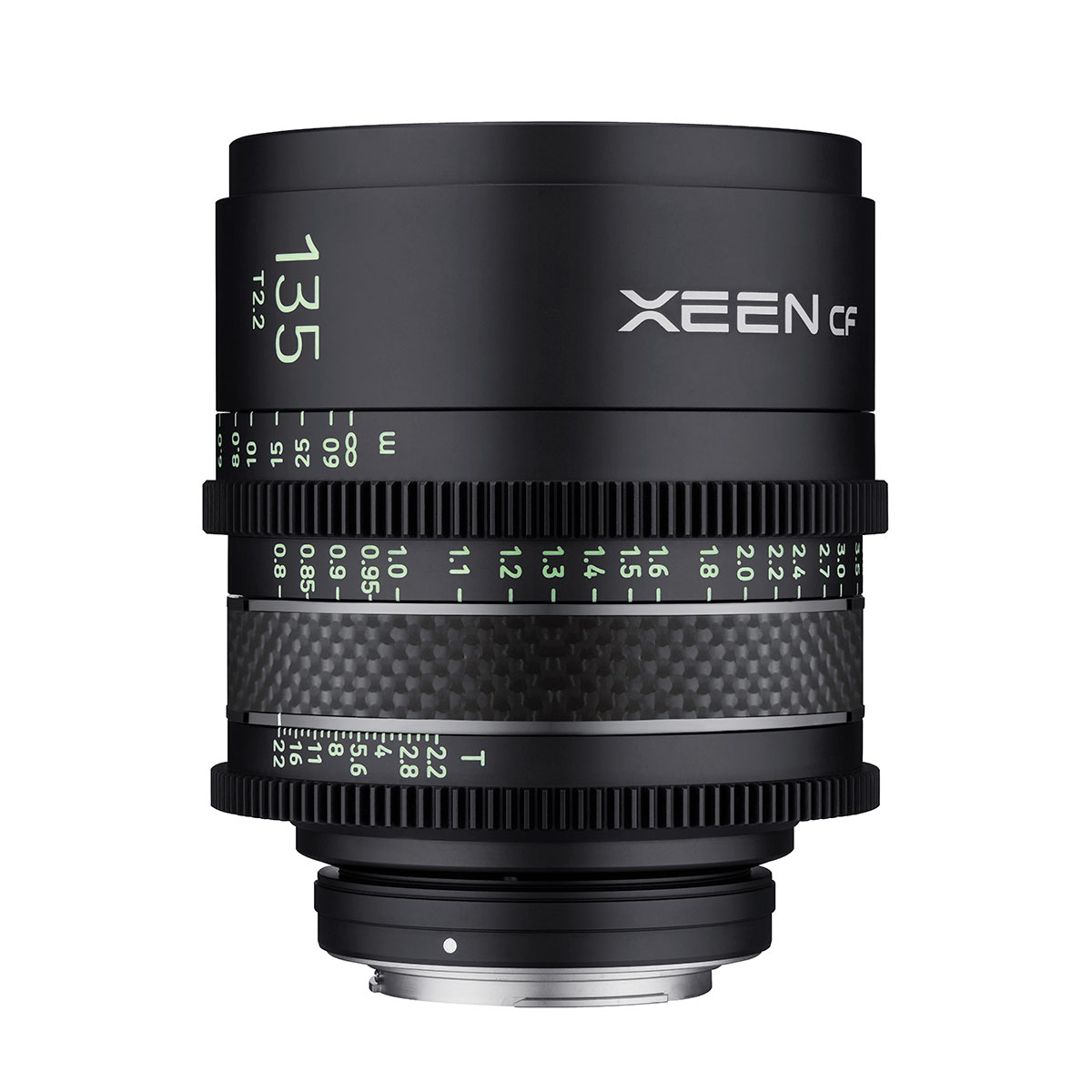 El objetivo manual para cine Samyang Xeen CF 135 mm T2.2 ofrece una alta resolución óptica (para los modernos sensores FF 4K/6K/8K), una construcción que incorpora elementos de carbono para reducir el peso sin perder resistencia, anillos dentados para el diafragma y el enfoque (rango de 200°), un tratamiento superficial X-Coating para reducir los reflejos y marcas luminiscentes de fácil lectura. Se fabrica en las versiones EF, FE y PL.