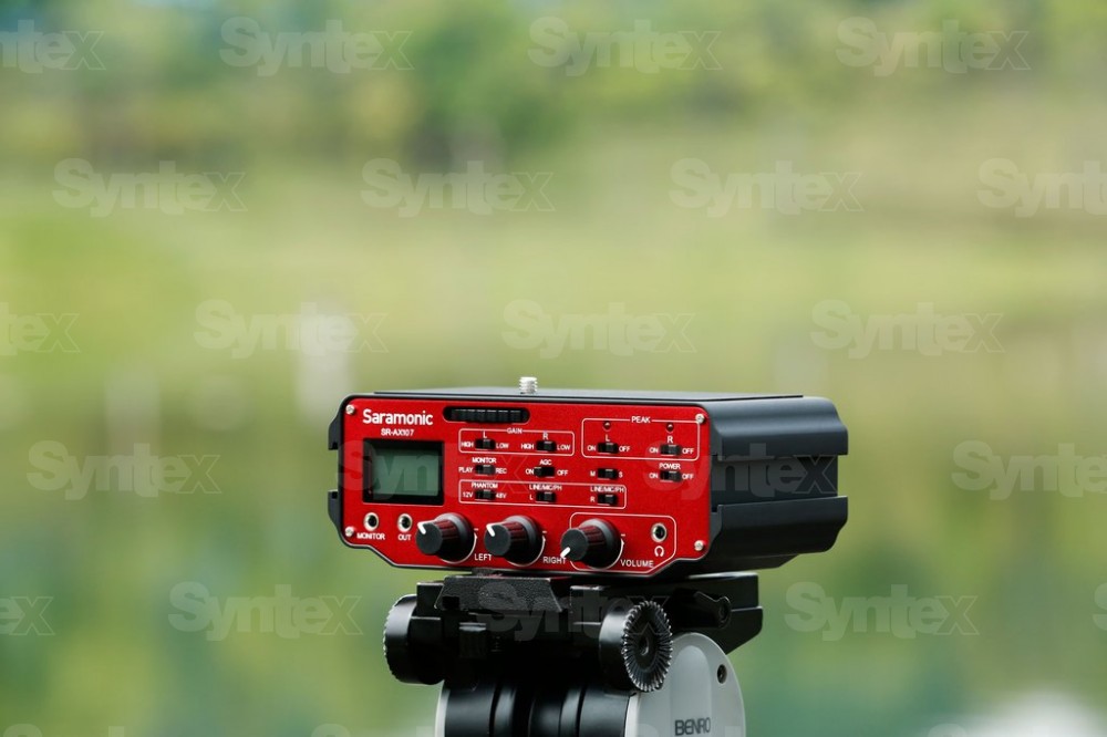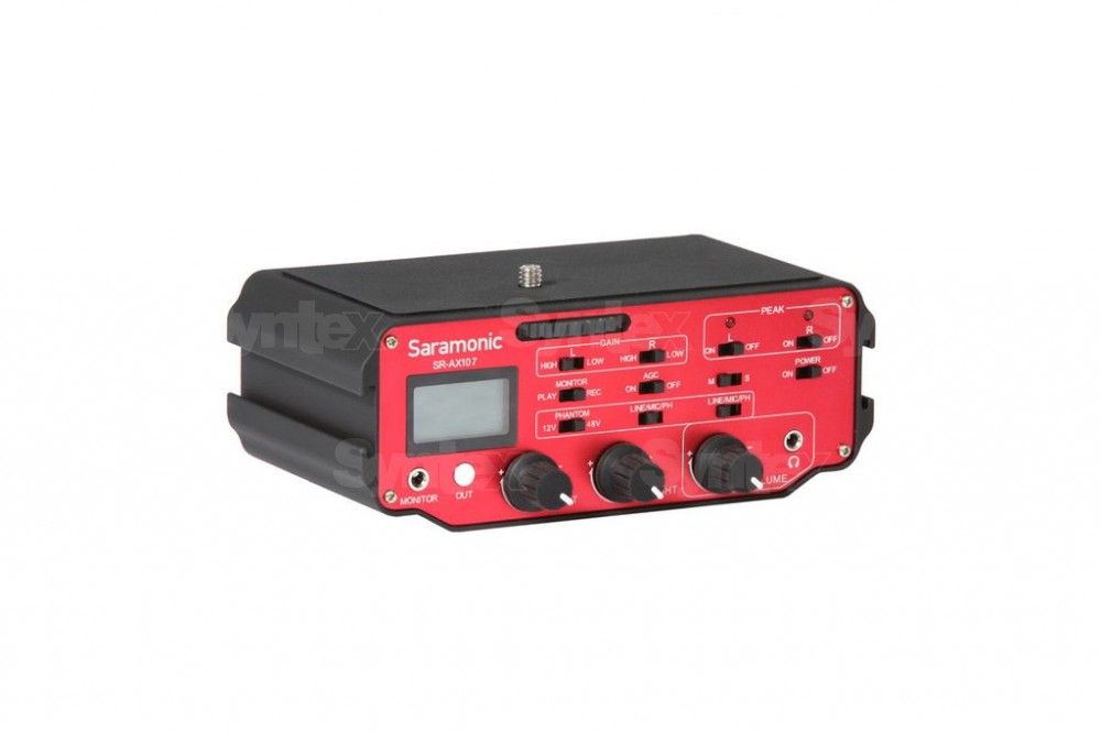 El modelo más alto de la gama de interfaces de audio Saramonic SR-AX para cámaras DSLR/DSLM y cámaras pequeñas es un mezclador de dos canales con electrónica activa, incluida alimentación fantasma. Ofrece dos entradas XLR balanceadas, un selector de ganancia (0 / 20 dB) y un atenuador de 40 dB (MIC/LINE), alimentación fantasma conmutable de 12 V o 48 V, medición de niveles (-18 – +3 dB en pasos de 3 dB), salida de auriculares con control manual de volumen, indicación de nivel de pico para cada canal, selector de fuente de escucha (entrada/salida), función AGC ON/OFF para desactivar el control automático de volumen en las cámaras que disponen de esta función (en la configuración OFF, el canal izquierdo contiene una señal sinusoidal de 20 kHz para eliminar el efecto AGC en los pasajes silenciosos), y también un transformador de aislamiento. Se fija a la parte inferior de las cámaras mediante un tornillo de trípode de 3/8", la misma rosca se encuentra también en la parte inferior del dispositivo, y ambos laterales cuentan con zócalos de flash para el montaje de otros accesorios. Pesa 0,51 kg, mide 15,2 x 9,5 x 4,4 cm y se alimenta con una pila de 9 V.