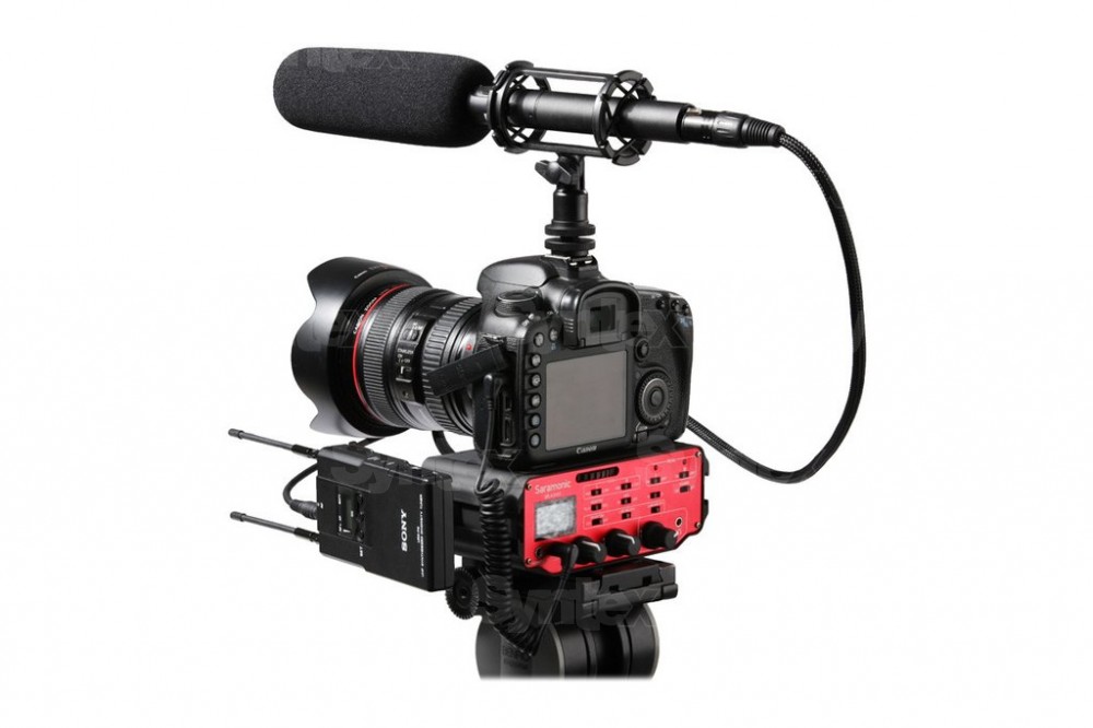 La gama de interfaces/mezcladores de dos canales de Saramonic para DSLR/DSLM y cámaras pequeñas incluye varios modelos, desde los muy sencillos y pasivos SR-AX100 y SR-AX101 hasta los sofisticados dispositivos SR-AX107 y SR-PAX2 con electrónica activa que ofrecen alimentación fantasma, preamplificadores con una ganancia de 20 dB y medidores de nivel. Los dispositivos se conectan a las entradas de micrófono TRS de las cámaras y se fijan mediante una zapata de flash o un tornillo de trípode.